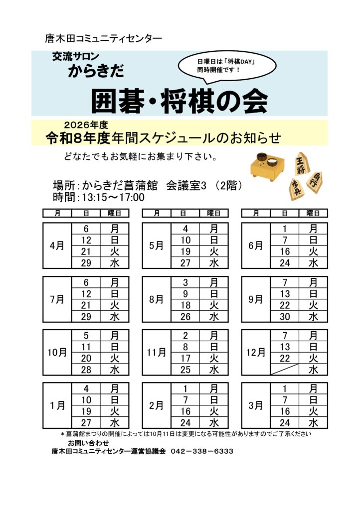 交流サロンからきだ囲碁・将棋の会 令和8年度スケジュール